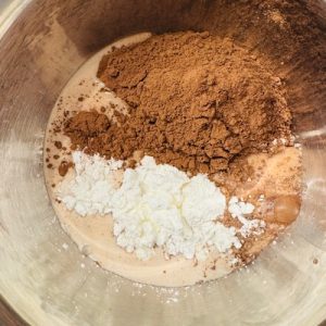 Punem 300 ml de lapte cu amidonul și cacaua într-un castron și omogenizăm.