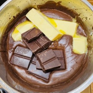 Adăugăm ciocolata și untul, lăsăm 2-3 minute după care amestecăm energic până compoziția devine uniformă.